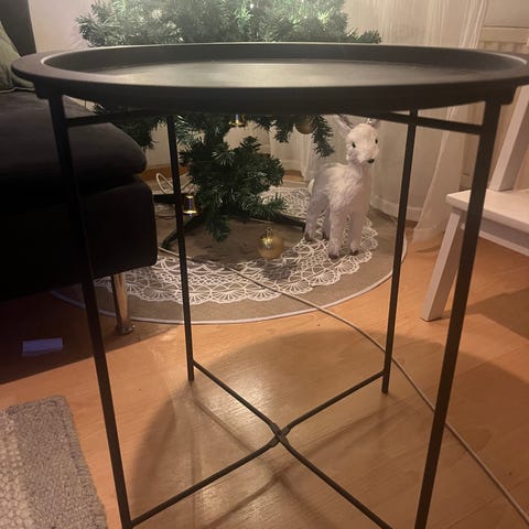 Musta, metallinen pyöreä pöytä esim. parvekkeelle, terassille tai apupöydäksi sisälle.