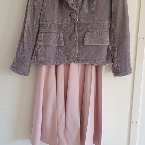 Täysin uusi juhlapuku, koko M, alkuperäinen hintalappu yhä mukana (49€). Yläosa on hohtavaa, silkkimäistä materiaalia ja edessä on kauniisti kerroksittain laskeutuva kaulus. Musta alaosa ja vyö korostavat vyötäröä ja luovat elegantin ilmeen. Kangas heijastaa valoa kauniisti ja tekee puvusta näyttävän. Ei koskaan käytetty.