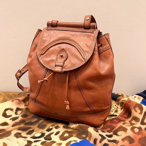 Violetti nahkainen Joy Ful -merkkinen bucket-mallinen olkalaukku. Sisällä ison osion lisäksi pieni tasku. Sekä nahkainen kantokahva, että pitkä ketjuolkahihna, jossa nahkainen vahvike. Molemmat irrotettavissa. Laukussa edelleen hintalapun nauha kiinni ja valmistajan lappu sisällä. Huippukunto.