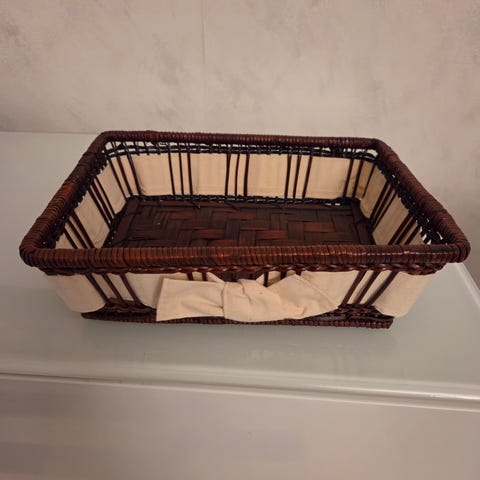 Villalangalla vuorattu kori jossa myös villakansi. Kori tehty pitämään vaikkapa perunakattilaa tai kahvipannua lämpimänä ruokailijoita odotellessa. Sopii erityiselle lahjaksi sellaiselle jolla on ennestään jo kaikkea. Mitat noin 43 x 31 x korkeus 40 cm