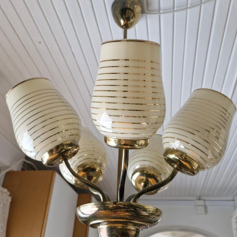 Perinteinen 1960-luvun kattovalaisin messinkirungolla. Kauniit, ehjät kuvut