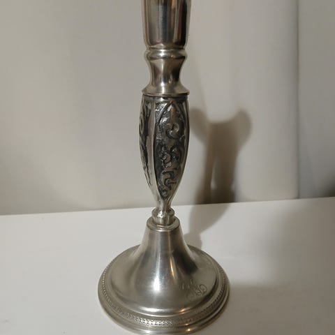 Tinateollisuus Himanen 60 HKI valmistama vanha 5:n kynttilän kynttilänjalka. Korkeus 15,5cm ja leveys n.31cm. Keskimmäisessä kynttiläkupissa sulanut reikä, näkyy kuvassa.