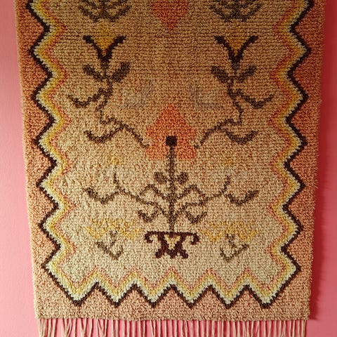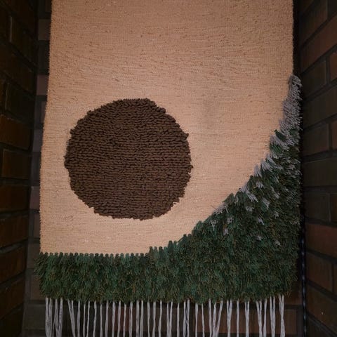 Todennäköisesti pellavakankaalle käsintehty "ristipistotyö", aihe juhannussalko ja kansantanssijat, teksti Åland, yläreunassa ripustusnauha. Koko 38x15 cm. Siisti, tahraton pikku "raanu".