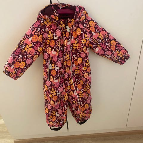 Kaunis kukallinen Reiman lämmin toppahaalari taaperolle. Haarojen saumoissa pientä kulumaa, muuten oikein hyvä kunto. Jalkalenkit puuttuu.