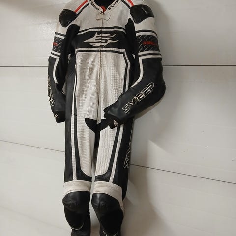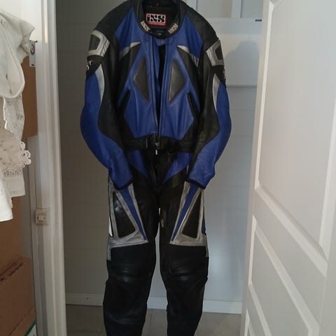 nahkapuku(takin etuvetoketju alaosastaan rikki), puku vahvaa nahkaa, housut ja takin saa vetoketjulla yhdistettyä