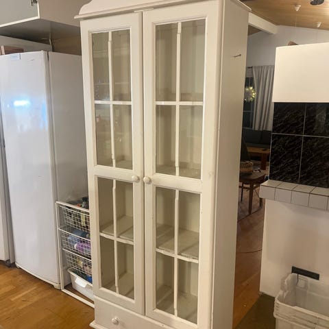 Massiivipuinen (mänty) vitriinikaappi moitteettomassa kunnossa. Koska kaappi on täyspuinen, se on aika painava ja pysyy tukevasti pystyssä ilman kiinnitystä seinään. Kuljetettava kokonaisena. Nouto Turun seudulla.