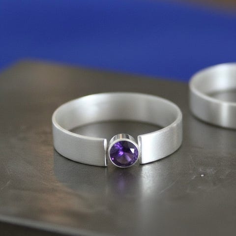 Sormus on leikattu 1mm sterlinghopeasta, juotettu, kiillotettu ja vasaroitu, ja siihen on lisätty timanttihiottu ametisti, 5mm