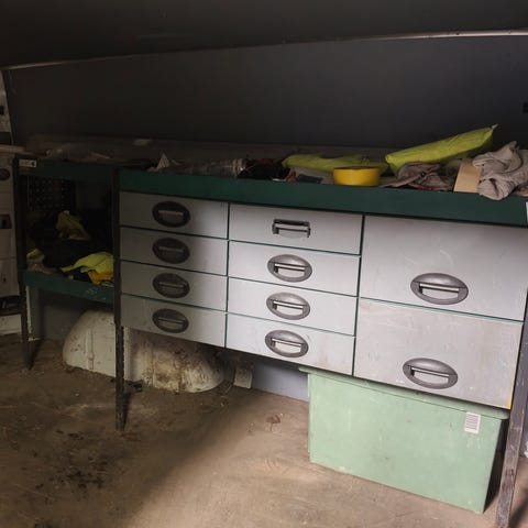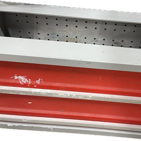 Työkaluhyllyjärjestelmä VW-transporter pakettiautoon, valmistettu metallista ja muovista. Sisältää useita hyllyjä ja neljä vetolaatikkoa työkalujen ja tarvikkeiden järjestämiseen. Soveltuu ammattilaiskäyttöön, tarjoaa tehokkaan säilytysratkaisun ajoneuvon sisätiloihin. Kiinnikkeet ovat mukana.