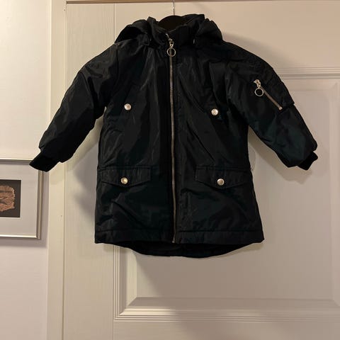 Lindex Kids lasten takki, koko 104 cm, hopeanvärinen. Takissa on tikattu pinta ja vetoketjukiinnitys. Sopii tytöille.