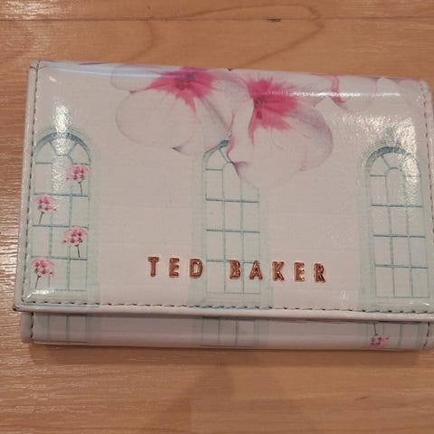 Ted Baker nahkainen naisten lompakko, jossa on kukkakuviointi. Lompakossa on vetoketjullinen osio ja useita korttipaikkoja. Sisäpuoli on vuorattu Ted Baker -logolla. Sopii pienten tavaroiden ja korttien säilytykseen. Koko n. 11 x 8,5 cm. Logossa, vetimessä ja kulmissa hieman kulumaa, muuten hyväkuntoinen. Tulee myös kirjepostina.