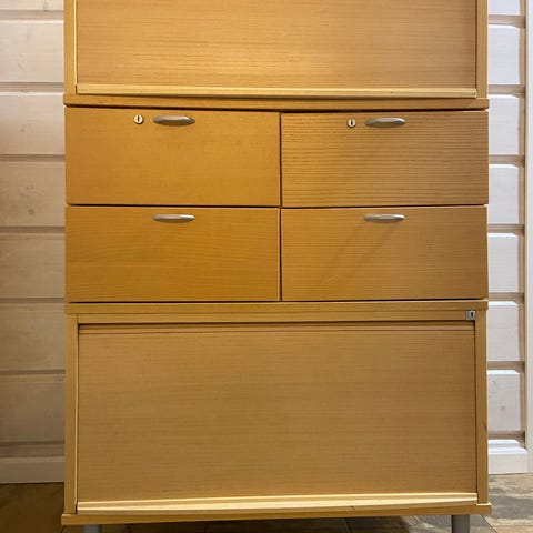 Toimistokäytössä ollut kaappi rulo-ovella. Tukeva, puun värinen.