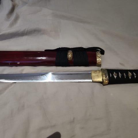 Kaiverrettu puinen katana kultakoristeilla, valmistettu Thaimaassa