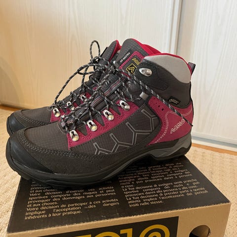 Super laadukkaat ja tukevat, Italiassa valmistetut vaelluskengät. Kokolappu haalistunut, mutta sopivat 40-41 koon jalalle. Paksua ja jämäkkää nahkaa kauttaaltaan. Good year welt, eli pohjat voi vaihtaa ammattitaitoisella suutarilla joskus tulevaisuudessa. Tällä hetkellä näissä on Vibramin todella hyvässä kunnossa olevat pohjat.
