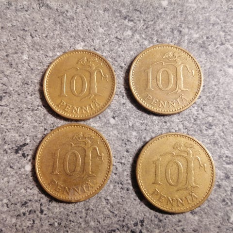 1960 ja 1970- luvun 5 pennisiä kuvassa näkyvät määrät sekä muutama 10 penniä, 5 markkaa v.1995 ja 2x 1 markka v.1998 ja 1993