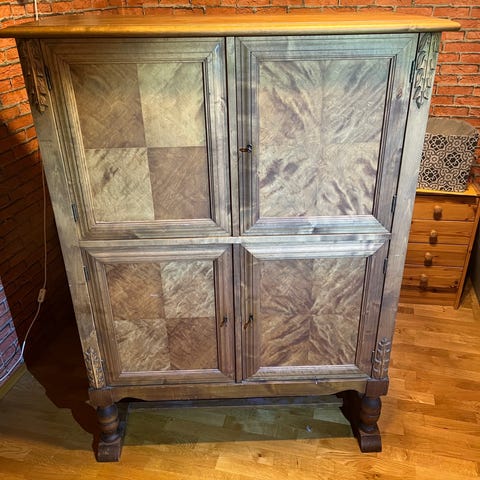 Kaunis,hienokuntoinen täyspuinen kaappi/lipasto.Mitat 130x60cm korkeus70cm.Kaksi kaappia ja keskellä laatikko,alkuperäiset vetimet,ei lukkoa.