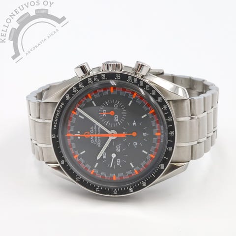 Tarjolle huippukunnossa oleva Limited Edition Speedmaster. Kelloa valmistettu ainoastaan 2020 -kappaleen rajoitettu erä. Erittäin upealla aurinkohiotulla harmaalla taululla josta löytyy ajanotto sekä pikkusekunnit. Taulun osoittimet, Omegan logo, kolmen aputaulun renkaat sekä indeksit ovat kaikki valmistettu Omegan 18K Sedna-kullasta. Teräksinen kuori jonka nupit ja kehä ovat niinikään 18K Sedna-kultaa, vihreä alumiini insertti kruunaa kokonaisuuden. Viimeisenä Omega laadukas teräsranneke jonka claspista löytyy käyttömukavuutta lisäävä microsäätö. Koneistona toimii tarkoin käyntiarvoin tikkaava Omega 1861 -manuaali jossa 48h käyntivara. Full set, kellon takuukortti on päivätty 7/2021.