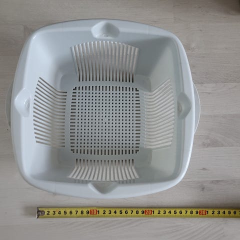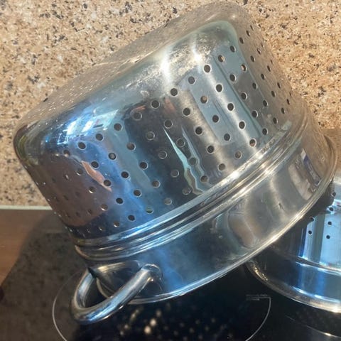 Hyväkuntoinen lävikkö / siivilä ruostumatonta terästä. Leveys 22cm, korkeus 20cm.