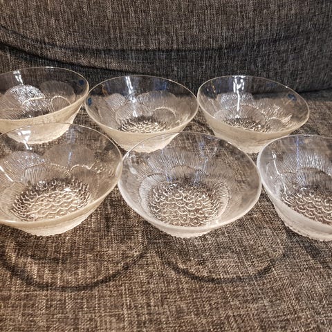 Käyttämättömät Nuutajärven Pioni jälkiruokakulhot. 8 kpl. Alkuperäinen pakkaus neljälle kappaleelle. Postikulut lisätään.