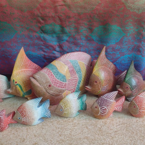 Myynnissä on kaksi viehättävää puusta valmistettua koristetta, jotka ovat kalan muotoisia. Kalat on maalattu käsin kirkkailla trooppisilla väreillä.