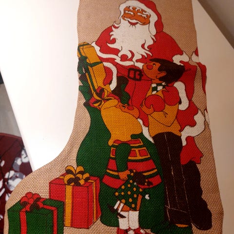 Siisti todella vanha joulusukka. Kirkkaat värit kankaassa. Kuva molemmilla puolilla.