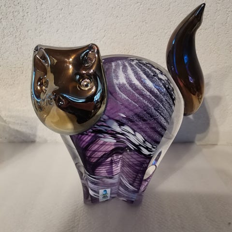 Pinkki ja Mustavalko raidalliset suomalaiset Studiolasin koriste lasiset kissat, 12 cm korkeat.