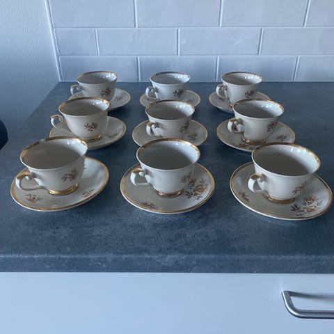 -6 hlön setti: 6 kpl kahvikuppeja, tasseja ja leipälautasia = 80e (kermakolla ja sokerikolla 108e)
