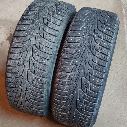 2 kappaletta nastakumeja joissa valtaosa nastoista poikki. Nastat nyppimällä vielä kesäkumeiksi. Pintaa kohtalaisen hyvin jäljellä.