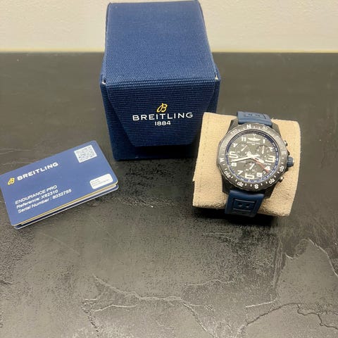 Tarjolle tyylikäs sekä sporttinen Endurance Pro 44. Selkeälukuisella mustalla taululla josta löytyy päivyri, ajanotto, pikkusekunnit sekä loistavan lumen omaavat osoittimet ja indeksi unohtamatta sinistä sisäkehää jonka ansiosta taulun väri elää hienosti eri valaistuksessa. Mustalla Breitlight kevytkomposiitti kuorella joka erittäin hyvin kulutusta kestävä sekä 3,3x kevyempi kuin titaani ja 5,8x kevyempi kuin ruostumaton teräs. Lisäksi kuori on hypoallergeeninen sekä magneettisesti stabiili. Safiirilasi suojaa kellon etupuolta kun taas umpinaisen takakannen alla tikkaa erittäin tarkasti Breitling 82 SuperQuartz koneisto. Kokonaisuuden kruunaa laadukas sininen kumiranneke omalla soljella. Full set, kellon elektroninen takuukortti on aktivoitu 12/2021.