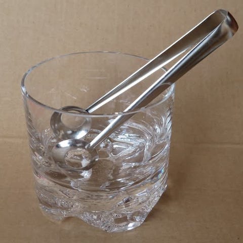 Iittalan kaunis ja klassinen jääpala-astia, pihdit kuuluvat mukaan. Tapio Wirkkalan 1970-luvun alussa suunnittelemaan Gaissa-kokoelmaan.