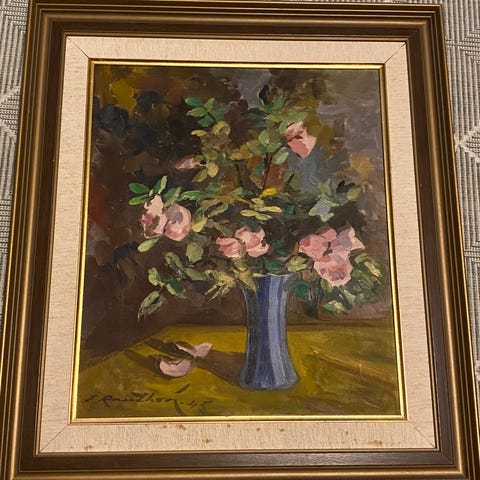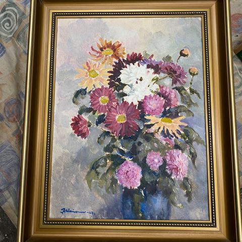Aarne Alanko kukka-asetelma-maalaus puukehyksillä.