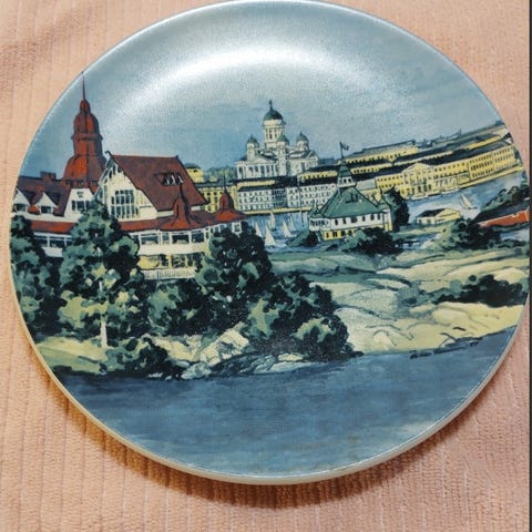 Tämän kesäisen Helsinki lautasen on piirtänyt taiteilija Veikko Roininen. Aiheena kappale kauneinta Helsinkiä - Esplanadin puisto ja sen varrella oleva Kappeli (ravintola), joka rakennettiin 1867 A.H. Dahlströmin piirustusten mukaan.