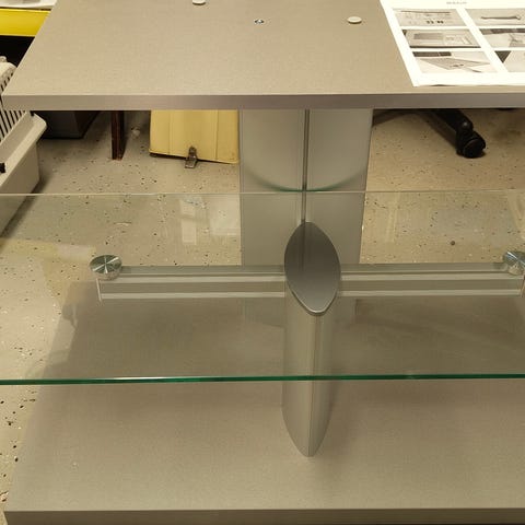 Ylälevy 70cm x 35cm, lasilevy 90cm x 38cm ja alaosa 80cm x 48cm. Yläosan hyllyväli 21cm ja alaosan 26,5cm. Saa hakea kahta kahvipakettia vastaan.