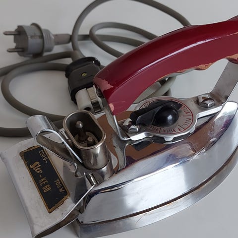 Sähköinen silitysrauta, jossa musta kahva ja metallinen pohja.