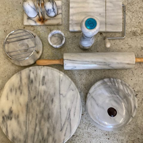 Marmorinen keittiövälinesetti, johon sisältyy kaulin, käsipaperiteline, mortteli, sokeri- ja suolasirotin, mauste-/pippurimylly ja pyörivä alusta.