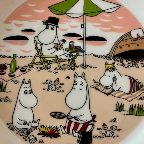 Tämä tummansininen lautanen julkaistiin vuonna 2010 ja sen valmistus päättyi vuonna 2013. Se kuuluu Arabian viralliseen Muumi-keräilysarjaan ja on järjestysnumeroltaan 19. Lautanen on osa Kaj Franckin suunnittelemaa Teema-sarjaa, ja sen kuvituksesta vastaa Tove Slotte, joka pohjasi työnsä Tove Janssonin alkuperäisiin piirroksiin.