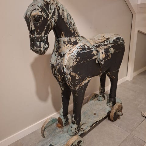 Vanha veistetty pyörillä oleva puuhevonen ehkä 1900 luvun alkupuolella vaikea sanoa