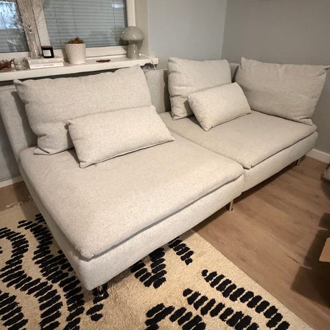 Söderhamn sohva, kulma osa. Selkätyynyt ja pikkutyyny kuuluu mukaan (ei näy kuvassa) Kissa kynsinyt kulmaosan käsinojaa (kuvassa 3 näkyy) Jos häiretsee voit vaihtaa selkönojien paikkaa niin menee piiloon. Mitat vikassa kuvassa. Nopea nouto etusijalla! Tarjoa kohtuullisesti.