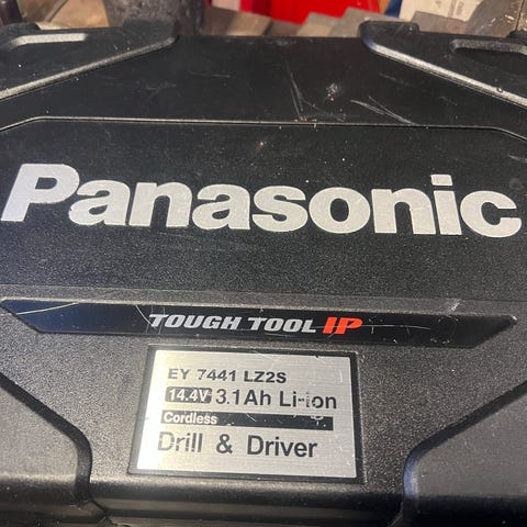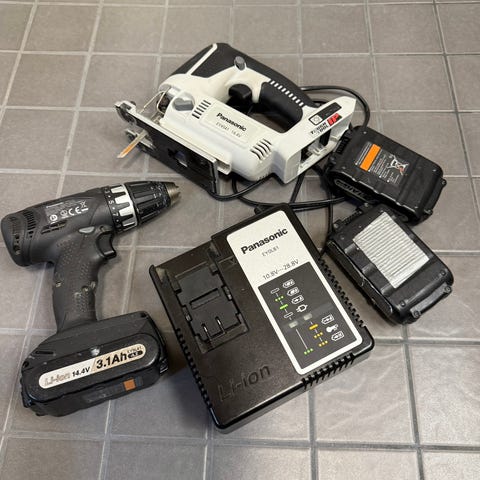 Panasonic akkuporakone, yksi akku ja laturi. Vanha ja käytetty, testattu akku ottaa virtaa vastaan ja kone toimii.