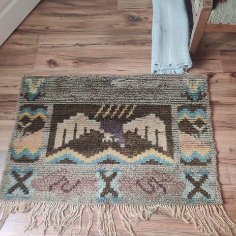 Vanha, perinneryijy. Käsin neulottu ; mallia ”sammaleen kukka” Koko 105*138 cm + hapsut. Ryijy ikäisekseen hyvässä kunnossa. Ollut tähän asti asuinhuoneiston seinällä.
