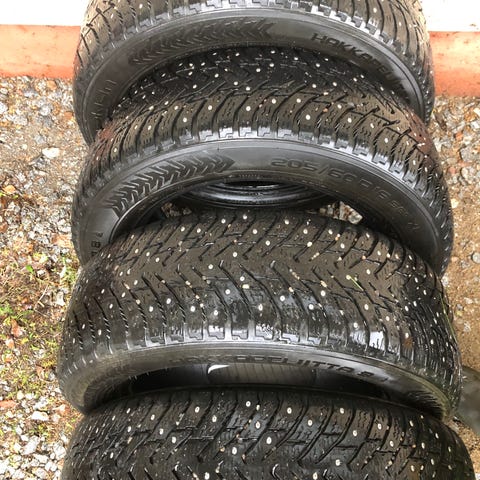 Neljä kappaletta nastarenkaita, hyvä kunto. Dynamo merkkiset, nastat paikoillaan. Pintaa 7-8mm. Paistopäivä 23/21.