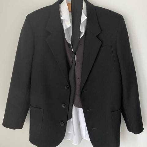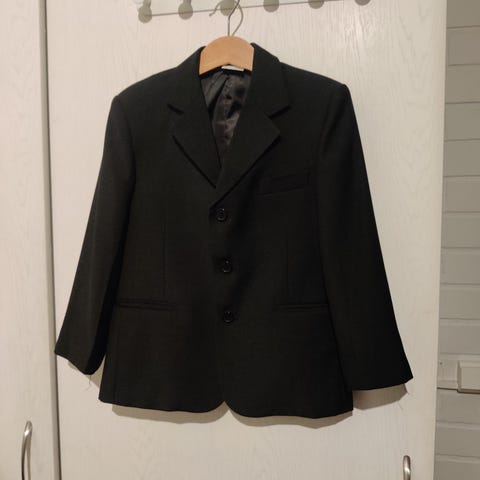 Tumma liivipuku, vastaa kokoa 137-145. Ollut käytössä 4.-5.-luokkalaisella, noin 140-senttisellä. Hoikalle lapselle housuihin tarvitsee vyön, muuten ok. 150-senttiselle liian lyhyet hihat.