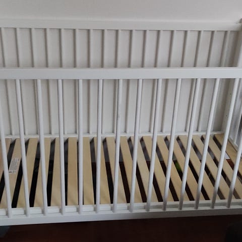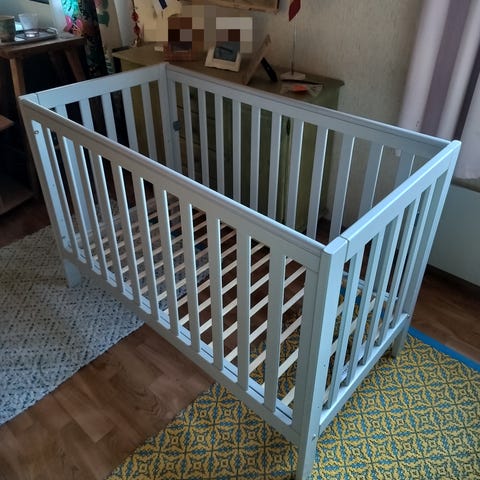 Pieni pinnasänky, vanha mutta ok siisti vielä. Pientä köytönjälkeä on siellä täällä, yleisilme ihan siisti. Ruuvit kaipaa kiristystä. Pohjan saa kahteen korkeuteen. Mukaan siisti patja, kahdella ollut käytössä, patjansuojus aina päällä.