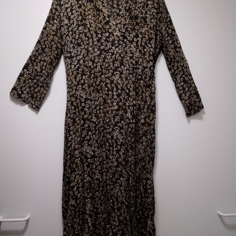 Natura muotimerkiltä musta naisten mekko, koko XL. Ostettu Portugalista ja suomalaiseen kokoon sanoisin M/L. Mekko on valmistettu polyesteristä ja viskoosista. Siinä on pitkät hihat. Helmassa ja hihansuiden koristeena on pitsi.