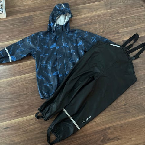 Tätä käytetty meillä vain pari kertaa. Tämä olikin meille vielä iso ja jouduin ostamaan koon pienemmän haalarin. Oli kokeilussa vähän yli 100cm lapsella. En pessyt myyntiin, pyyhkäisin vain kostealla. Pinnassa paikoittain pientä tahraa. Tikkivuoressa pari langanvetoa. Tikkivuorellinen asu on sopivan lämmin ja lapsen helppo pukea, kun kangas on liukuva. Ovh oli 110€. Uudesta ja savuttomasta koirataloudesta.