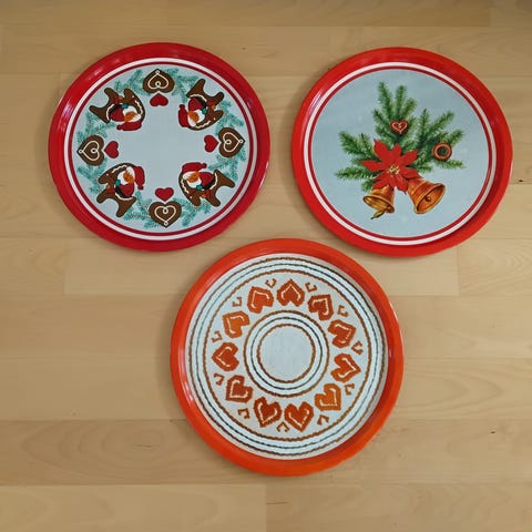 Myyn 2 tarjotinta. Pääsiäistarjotin priimakunnossa hinta 4 eur , Joulutarjottimessanäkee myös kuvassa pari naarmua. Hinta 2 eur.Molemmat valmistettu Viron Normassa.Yht.hinta 5 eur.