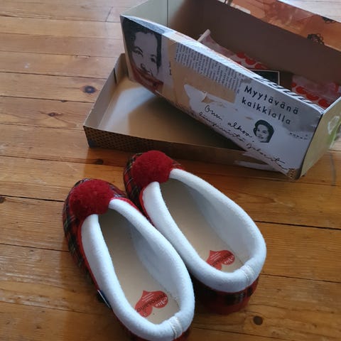 Uudet alkuperäispaketissa olevat Aino tossut. Kuitti tallessa. Ostettu 30.3.2019, jolloin uutisoitiin, että tossujen valmistus loppuu Suomessa.