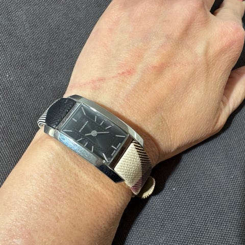 Burberryn naisten kello. Mustavalkoinen ranneke. Ranneke käytössä likaantunut. Pystynee varovasti pesemään. Pariston vaihto jää ostajalle.