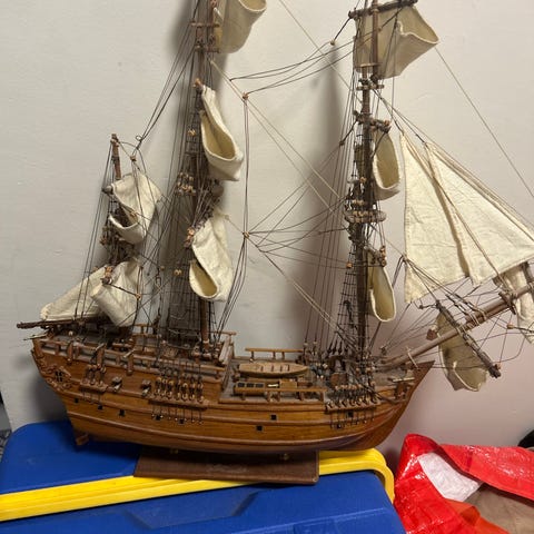 Osittain todella hyvässä kunnossa ja osittain vähän kulunut. Pysyy hienosti pystyssä vielä mutta vähän korjattava olisi. Katso kuvat. Pienellä työllä tästä saisi upean laivan vielä ja kaunis koriste esine. Eli jos täältä löytyisi joku kun on kiinostunut tehdä pieni remontti oman maun mukaan niin niin saisi halvalla tämän laivan