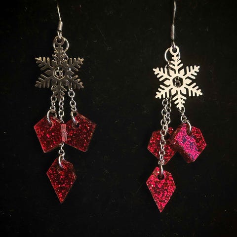 Myydään käyttämättömät punaiset glitter -korvakorut koukuilla.