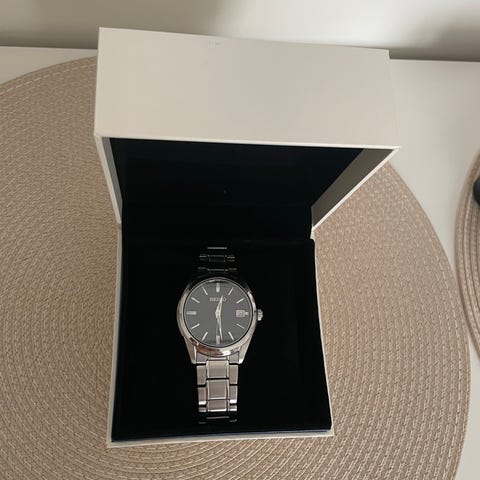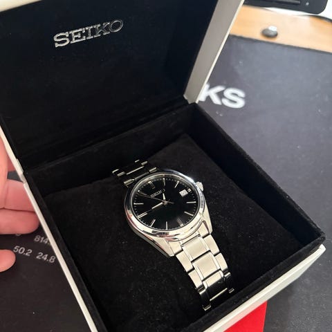 Seiko miesten rannekello, jossa on hopeanvärinen teräsranneke ja valkoinen kellotaulu. Kellossa on selkeät mustat numerot ja päivämääränäyttö. Mukana alkuperäinen Seiko-lahjalaatikko.
